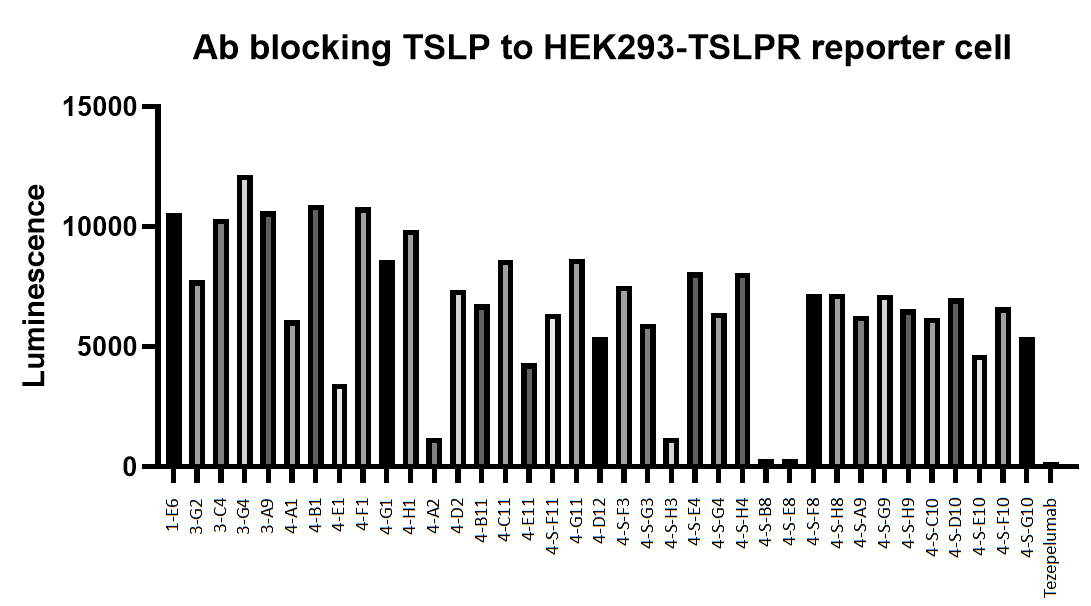 其中4株抗体具有明显较强的阻断功能,其中4-S-B8和4-S-E8的阻断活性和上市抗体Tezepelumab相当。